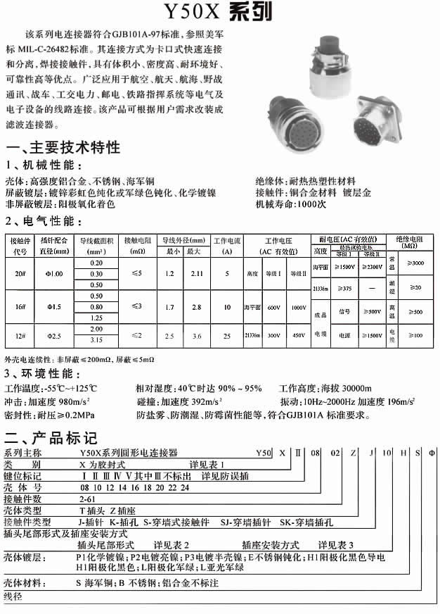 Y50P圆形屏蔽式航空插头,屏蔽接插件包括公制、英制、电源三大类电连接器。均为内螺旋槽卡销锁紧式。具有快捷连接与分离,体积小、重量轻,密封性能好,抗拉性能优之特点。插头电缆罩有七种安装方式,壳体分屏蔽与非屏蔽,电缆引出有直式和弯式,端接方式为焊接式。品种多,规格全。均参照GJB101A—97,GJB598A—96,MIL—C—26482等标准的要求。适用于战略、战术系统,野外作业等电讯号、电能的连接。
